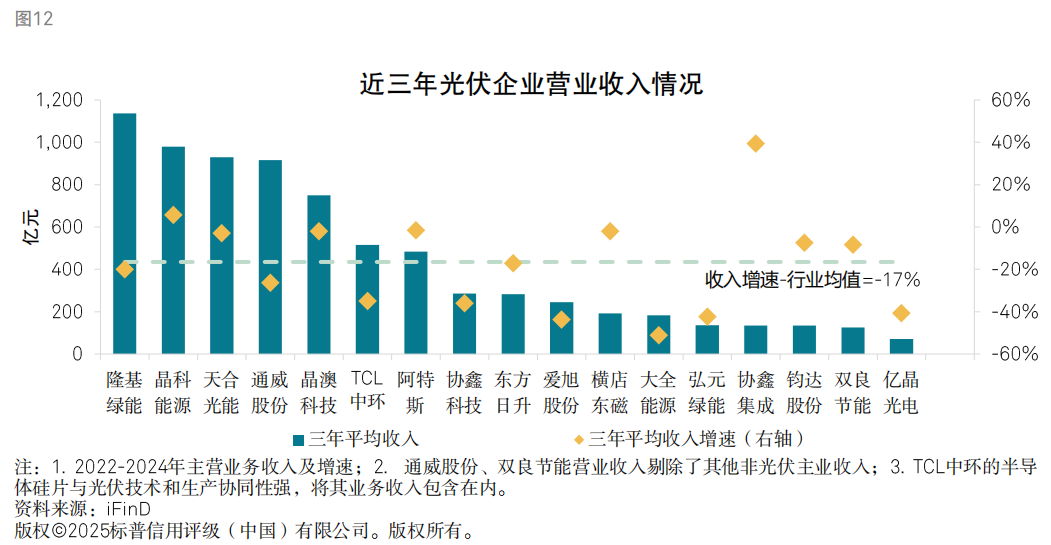 根据我们观察,光伏制造企业在2022–2024年间经历了深刻的结构性调整,样本企业整体营业收入复合增速约为-17%,显著低于此前的高速增长阶段。在此背景下,企业间规模分化日益明显:头部企业持续巩固市场地位——以隆基绿能、晶科能源、天合光能、通威股份、晶澳科技为代表的龙头企业,不仅营收体量稳居行业前列,其收入增速亦普遍高于或接近行业均值,展现出一定抗周期能力与全球市场拓展韧性。