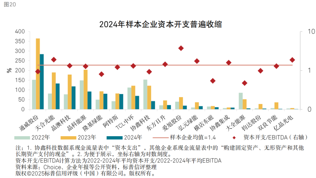 光伏行业为重资产属性,企业长期维持高资本开支,2024年盈利与EBITDA恶化导致行业资本开支显著收缩,但部分企业仍保持高开支刚性。此类企业抗风险能力较弱,易受技术路线失误、高杠杆、融资约束及现金流承压等多重压力,更易陷入流动性危机。