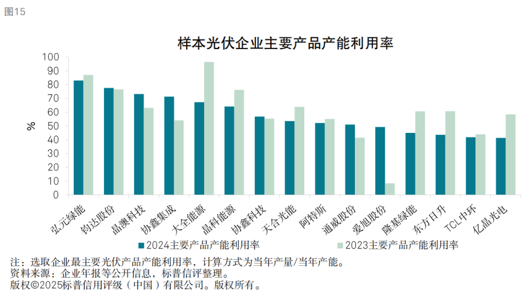 我们分析了样本光伏企业主要产品的产能利用率,2024年,绝大多数企业产能利用率与2023年相比出现回落,普遍降至40%–70%区间,部分企业甚至低于40%,产能利用率持续处于行业低谷。此外,政策层面的引导也在推动行业“反内卷”转型,工信部等部门出台政策限制盲目扩产,并鼓励优化产能结构,促使企业主动减产以应对挑战。我们预计,2025年,随着市场化产能出清进入后程、行业自律及政策引导不断推进,光伏企业有效产能利用率将有所好转。