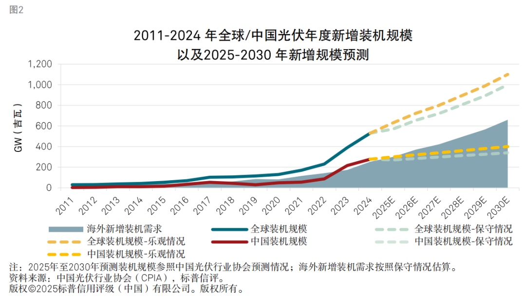 在全球碳减排共识推动下,光伏作为可再生能源的核心,长期需求前景向好,但中国市场已经趋于饱和,增速受限。国际可再生能源机构(IRENA)在《全球能源转型展望》报告预测,为实现全球平均温升控制在1.5°C以内目标,到2030年全球光伏装机将超5400GW(仍有超一半空间);国际能源署(IEA)在《2024年可再生能源分析与展望》中指出,到2030年新增光伏装机量将占据所有新增电源形式的70%。随着成本下降和新兴市场崛起,全球光伏仍将保持较快增长。