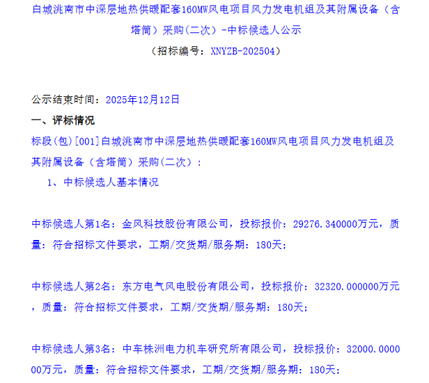 白城洮南市中深层地热供暖配套160MW风电项目风力发电机组及其附属设备(含塔筒)采购(二次)第一中标候选人为金风科技,投标报价为2.9276亿元,折合单价为1830元/kW。