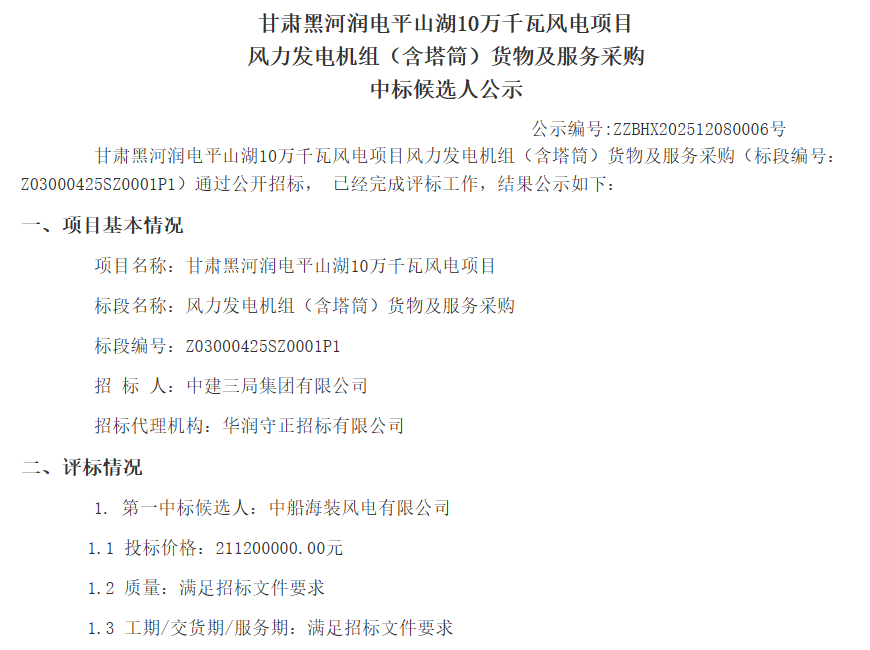 根据公示,第一中标候选人为中船海装,投标报价为2.112亿元,折合单价为2112元/kW。