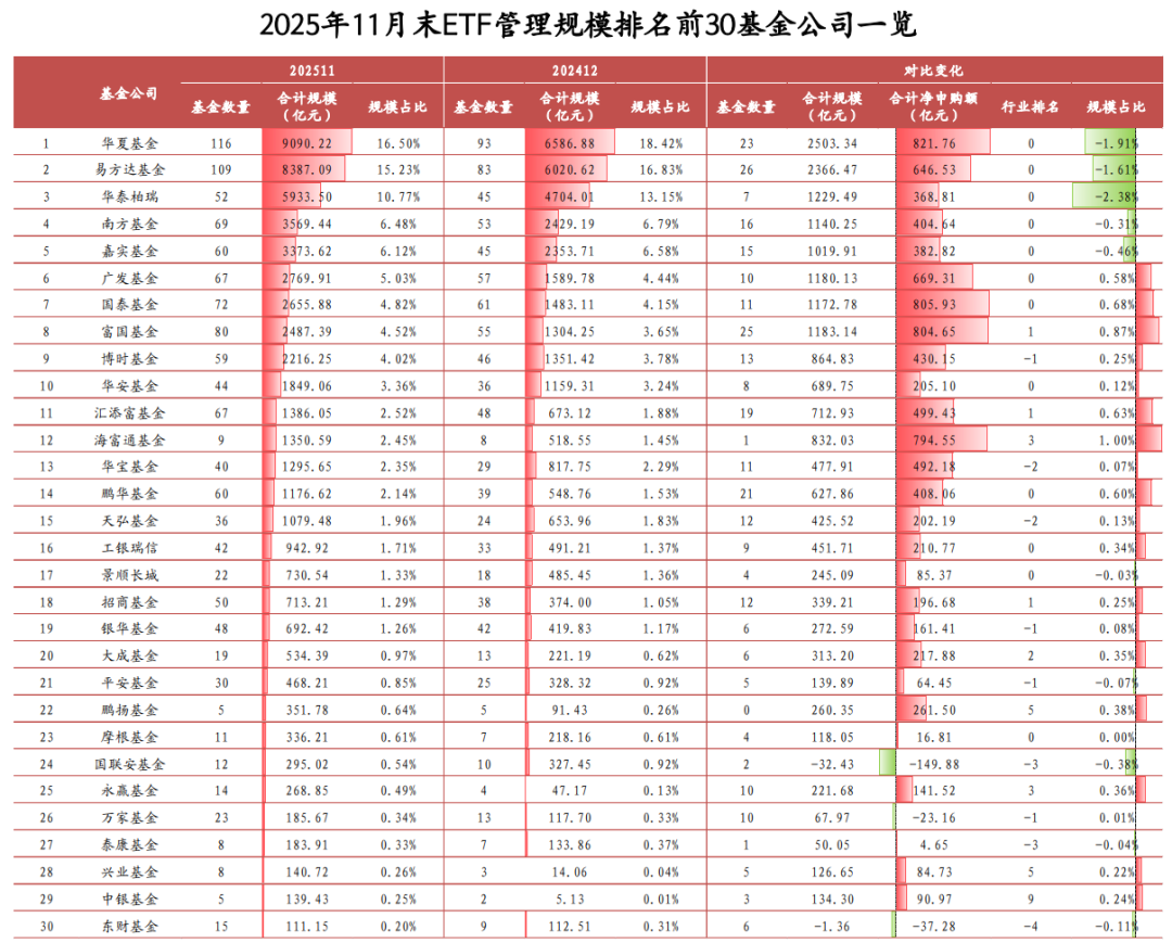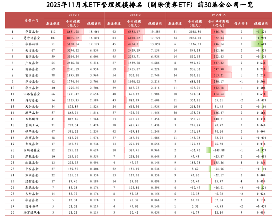 截至2025年11月末,30家基金公司ETF基金管理规模超百亿元,较2024年末增加4家;8家公司规模增幅超千亿元,若剔除存量产品净值增长所带来的规模增量,华夏、易方达、广发、国泰等6家公司净申购额超500亿元。