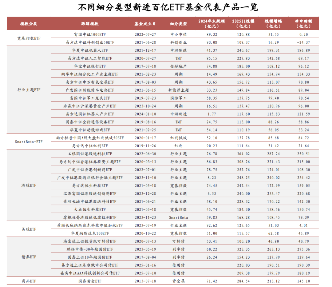 百亿产品:2025年11月末规模超百亿元ETF基金数量为118只,其中63只为新进百亿产品,主要集中在行业主题ETF(17只)、港股ETF(11只)、债券ETF(28只)三大细分方向。