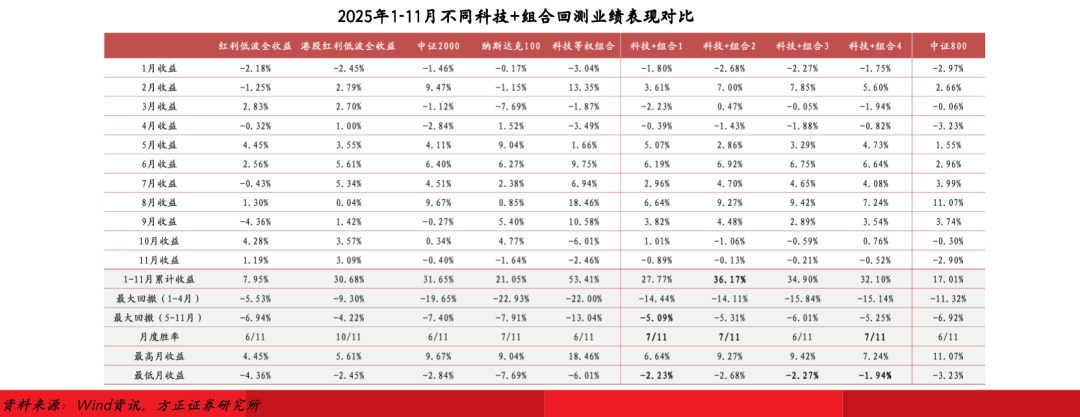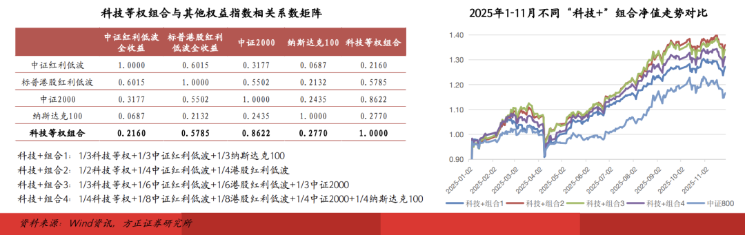 我们使用2025年1-11月的时序日收益率数据,计算科技等权组合与红利(中证/标普港股红利低波)、小微盘(中证2000)、美股(纳斯达克10)代表资产的相关系数。科技等权组合与中证红利低波及纳斯达克100指数的相关系数最低,均在0.20左右,与港股红利低波及中证2000指数的相关系数略高,分别为0.58和0.86。从构建低相关性组合的目标出发,选择科技等权组合、中证红利低波、纳斯达克100三类资产构建组合效果最优。此外,我们额外构建三个“科技+”组合作为对照组,以对不同资产配置组合的回测业绩结果进行对比。