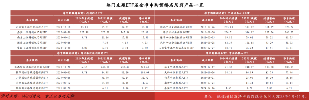 对于部分未有明确规模领先优势龙头产品的投资主题赛道,例如港股创新药和人形机器人,在未进行前瞻产品布局的情况下,随着行情演绎及时补发产品同样可实现一定规模增长。工银港股通创新药ETF、招商/南方中证机器人ETF等产品均成立于2025年年中,产品上市以来净申购额均超10亿元,虽较对标先发产品存在较大差距,但对新发产品而言已是不俗成绩。