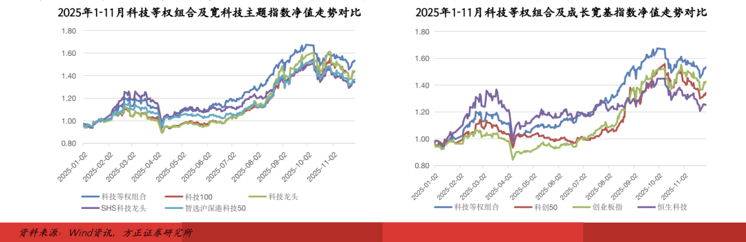 我们选择科创芯片、创业板人工智能、动漫游戏、机器人产业、港股通互联网、港股通创新药、中证电池、卫星通信8只细分科技主题指数进行等权配置,计算2025年1-11月科技指数等权组合的业绩表现,并将其与各细分科技指数及4只宽科技指数的业绩表现进行对比。