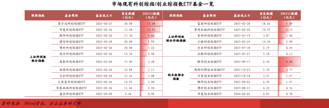 跟踪全指指数的ETF基金已有产品问世,但市场认知度较低,产品的适用投资场景及目标客户画像尚不清晰,现有产品规模体量较小。华泰柏瑞基金于2023年10月发行的中证A股ETF最新规模仅为1.35亿元;跟踪创业综指的6只ETF基金中,4只产品最新规模均不足2亿元;跟踪科创综指/科创价格指数的18只ETF基金中,仅有易方达和华夏两家公司旗下产品最新规模高于10亿元,12只产品最新规模低于5亿元。