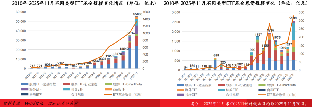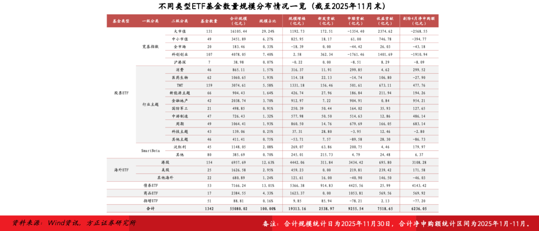 市场变化:截至2025年11月末,全市场1342只非货ETF合计规模55080.02亿元,较2024年末增长19313.16亿元,规模增幅高达54.00%;行业主题/海外/债券ETF三类产品规模增长领先,较2024年末分别增长4773.94亿元/5022.90亿元/5366.38亿元,宽基指数ETF规模增长2002.65亿元,主要是由于资金赎回退出(-3107.78亿元)拖累所致。