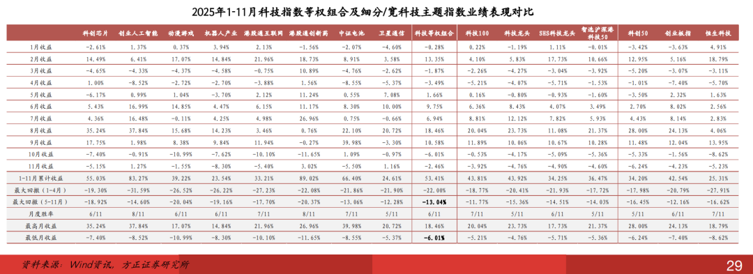 2025年1-11月科技指数等权组合累计收益53.41%,高于4只宽科技指数以及动漫游戏、机器人产业等4只细分科技主题指数;11个月中,组合有6个月实现盈利,胜率超过50%,月度最高收益为18.46%,逊于多数细分/宽科技主题指数,但最低月收益仅为-6.01%,明显优于除卫星通信外其余7只细分科技指数。
