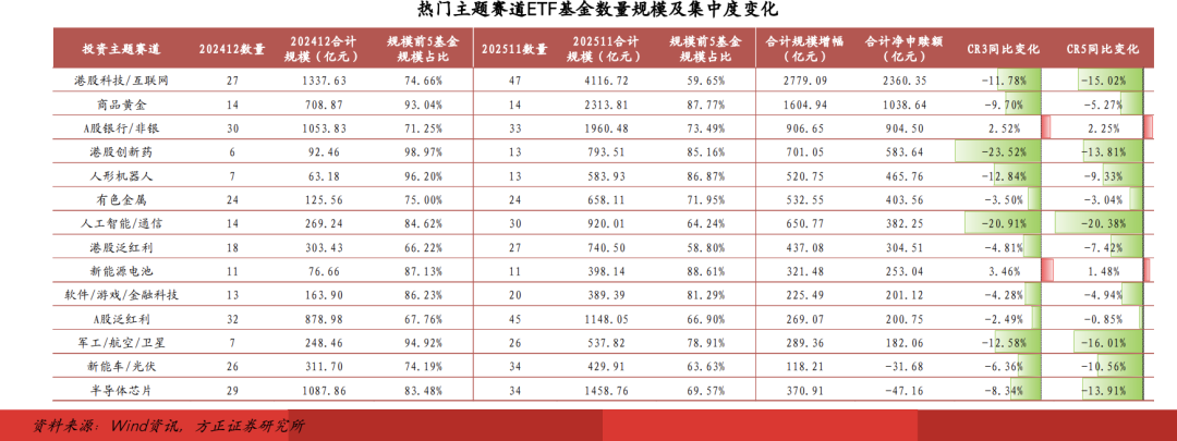 港股互联网、港股创新药等热门主题年内业绩表现亮眼,吸引市场基金积极申购,带动对应ETF产品规模增长。非头部产品在吸引申购资金方面展现出不输于头部产品的竞争力,抢占了更高的市场份额,多数热门主题赛道规模集中度出现下降。
