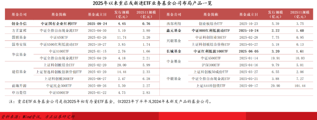 2025年初以来,多达14家基金公司重启或新进ETF业务,新发产品多为监管积极推动的A50ETF、A500ETF、科创综指ETF及现金流策略ETF基金;创金合信、鑫元、长城三家此前未发行管理ETF基金的新进公司均选择红利/红利低波ETF作为首发产品。