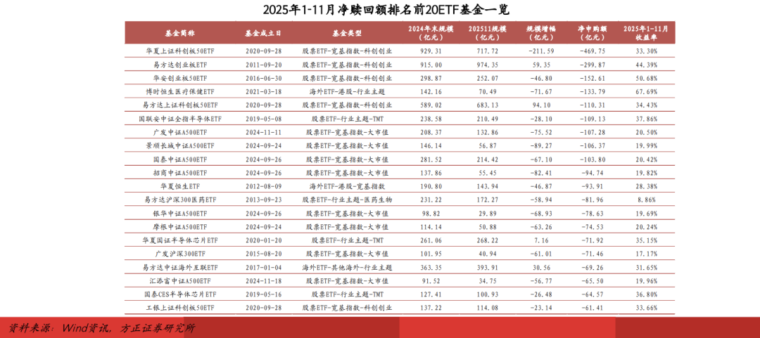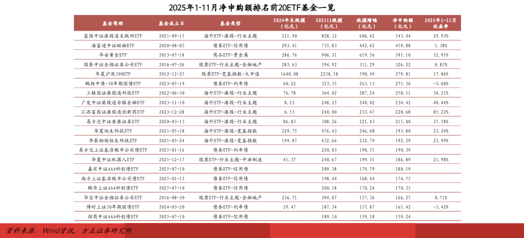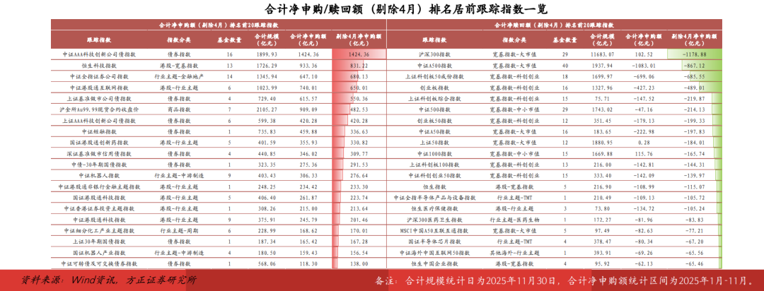 具体到个基,2025年1-11月净申购额排名前20ETF基金以高弹性的A股行业ETF及港股ETF为主,同时包括多只新发基准做市公司债ETF和AAA科创债ETF;核心宽基ETF中,仅有华夏沪深300ETF净申购额进入前20,但若剔除4月中央汇金的大额申购(4月净申购额347.44亿元),净申购额转为负值,多只跟踪科创50、创业板指、中证A500指数的宽基ETF净赎回额超百亿元。
