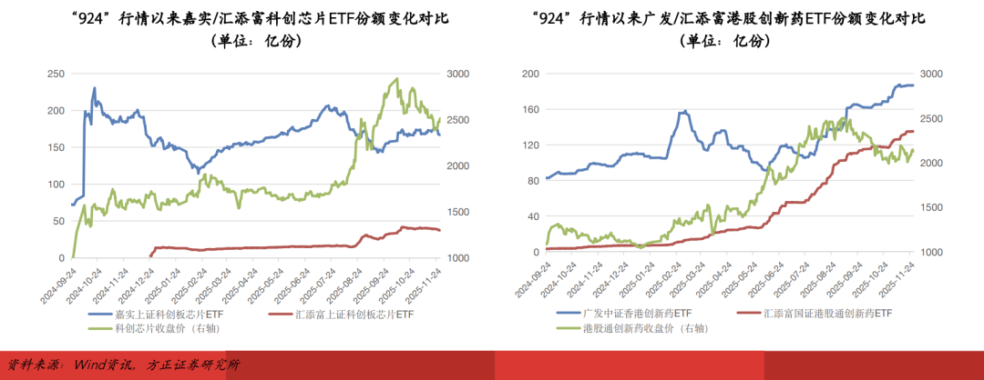 以科创芯片ETF为例,2022年成立的龙头产品嘉实科创芯片ETF净申购额为23.60亿元,2024年成立的汇添富/南方科创芯片ETF净申购额分别为36.40亿元和15.30亿元,最新规模较2024年末水平分别增长3.28倍和4.59倍,前者的净申购额甚至高于嘉实科创芯片ETF。
