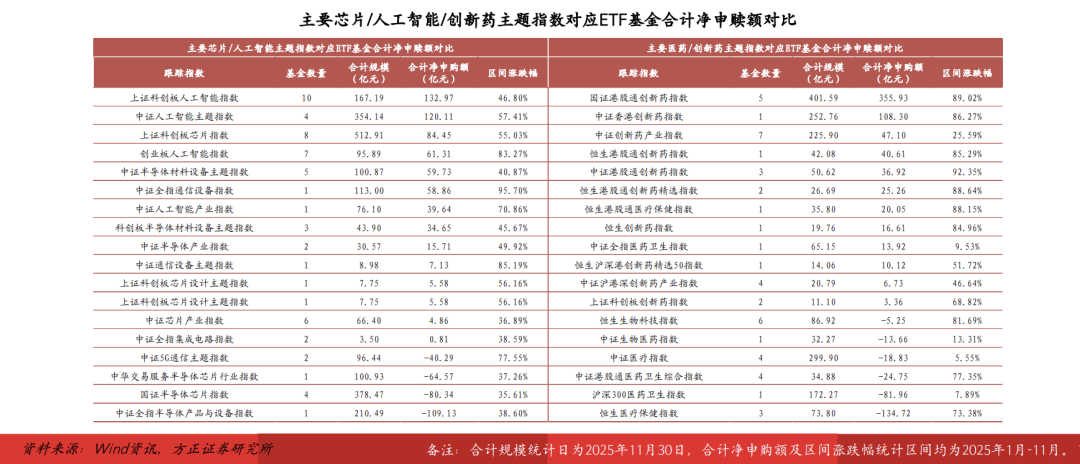 2025年1-11月全部ETF合计净申购额为9255.54亿元,主要流向TMT、金融地产、周期等热门行业,以及港股ETF、债券ETF、商品ETF三大板块;大市值/科创创业宽基板块整体净流出额均超过千亿元,若剔除4月中央汇金增持所带来的增量资金,两个板块净赎回额分别为2568.55亿元和1910.94亿元。具体到A股/港股行业ETF,申购资金偏好持仓聚焦、弹性更高的创新热门主题标的,部分成立较早的产品遭遇大额赎回。