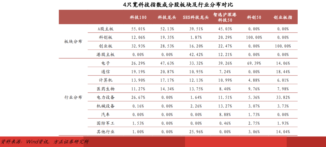 4只宽科技指数均重点覆盖电子、通信、计算机、医药生物四大行业,科技100指数额外覆盖电力设备行业,SHS科技龙头行业指数额外覆盖港股互联网行业,智选沪深港科技50指数额外覆盖电力设备和机械设备行业。