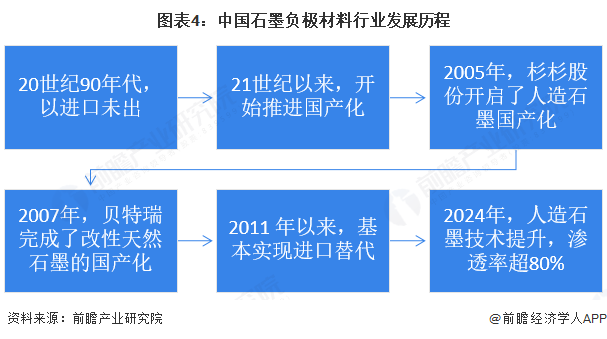 20世纪90年代,中国石墨负极材料市场主要为日本企业占据,进入21世纪,中国石墨负极材料逐渐实现国产化。2005年,杉杉股份开发了人造石墨负极材料新品FSN-1系列,完成了人造石墨国产化,2007年贝特瑞完成了改性天然石墨的国产化。2011年以来,石墨负极材料领域大部分已经实现了进口替代;人造石墨技术发展迅速,渗透率不断提升,2024年已经超过80%。