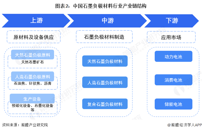 石墨负极材料行业上游主要为原材料和设备供应商,天然石墨负极材料的上游原料为天然石墨矿石,人造石墨负极材料的上游原料包括针状焦、石油焦、沥青焦等,在锂电池负极材料的设备方面,主要包括预碳化设备、石墨化设备等;中游为石墨负极材料制造企业;下游为各类型电池产品。