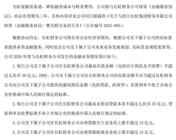 公司及下属子公司在长虹财务公司办理票据开立业务的上限不超过15 亿元。