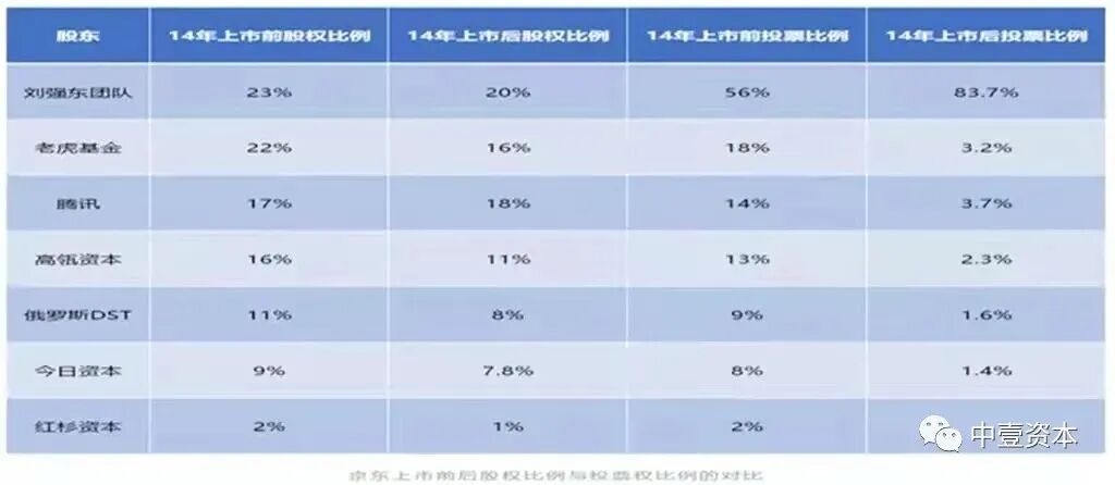 4、 投票权委托。例如京东(JD纳斯达克)。刘强东团队上市前股权比例为23%,但老虎基金、腾讯、高瓴资本、今日资本等11家投资人将其投票权委托给了刘强东团队行使。上市后,刘强东团队虽然持股20%却拥有了83.7%的投票权,具体如下表格所示。