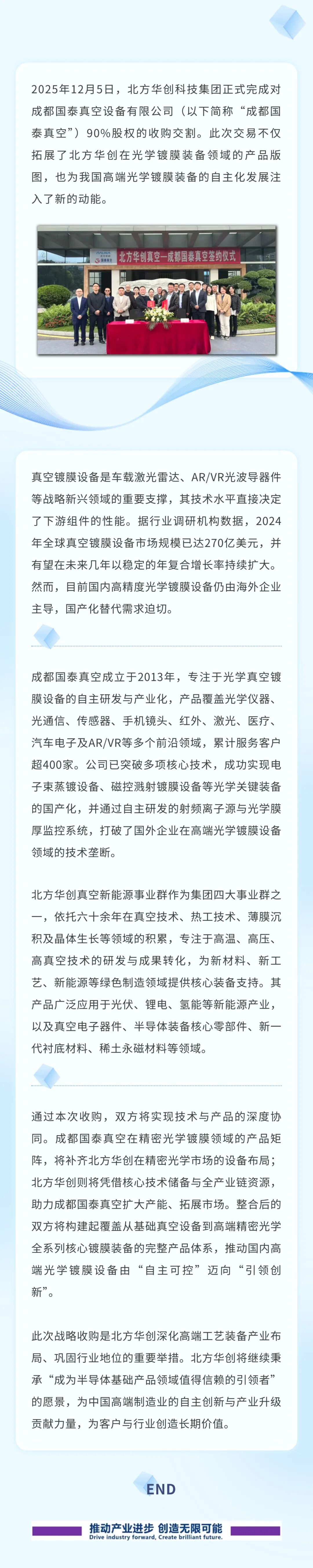 【NAURA GO】北方华创战略收购成都国泰真空90%股权 筑牢高端光学镀膜装备国产化基石