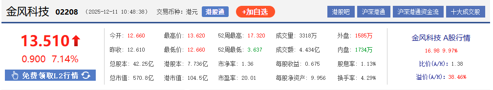 上证报中国证券网讯(记者 杨子晏)12月11日,金风科技H股开盘报12.66港元/股,盘中一度涨近8%,最高价报13.62港元/股。截至10时48分,金风科技H股报13.51港元/股,涨7.14%。同时,金风科技A股涨停。