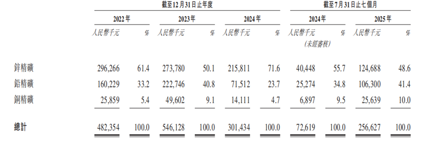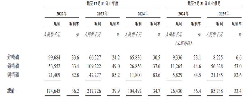 从收入结构来看,公司收入高度集中于核心精矿产品,且锌精矿为主要收入来源。2022年至2024年及2025年前七个月,锌精矿收入分别占总营收的61.4%、50.1%、71.6%及48.6%,铅精矿占比分别为33.2%、40.8%、23.7%及41.4%,铜精矿占比则为5.4%、9.1%、4.7%及10.0%。客户结构方面,有色金属贸易商为主要收入贡献方,同期来自贸易商的收入占比分别为77.1%、74.4%、75.4%及83.7%,精炼厂收入占比则为22.9%、25.6%、24.6%及16.3%,显示出公司在贸易渠道布局的深度优势。