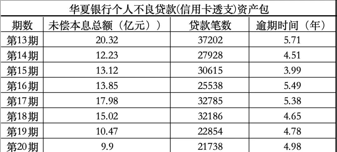 12月3日至4日,华夏信用卡中心集中推出第13-20期共8个不良贷款资产包,全部为信用卡透支类不良贷款,未偿本息总额合计113亿元,规模创下近期行业单机构处置新高。