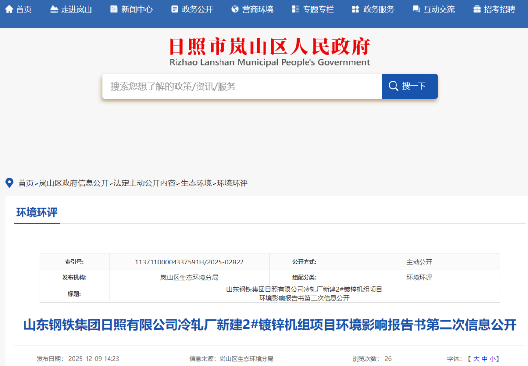 根据《环境影响评价公众参与办法》(部令第4号)、《关于发布<环境影响评价公众参与办法>配套文件的公告的相关要求》(生态环境部公告2018年第48号),对山东钢铁集团日照有限公司冷轧厂新建2#镀锌机组项目环境影响报告书环境影响评价进行第二次信息公示并征求公众意见。