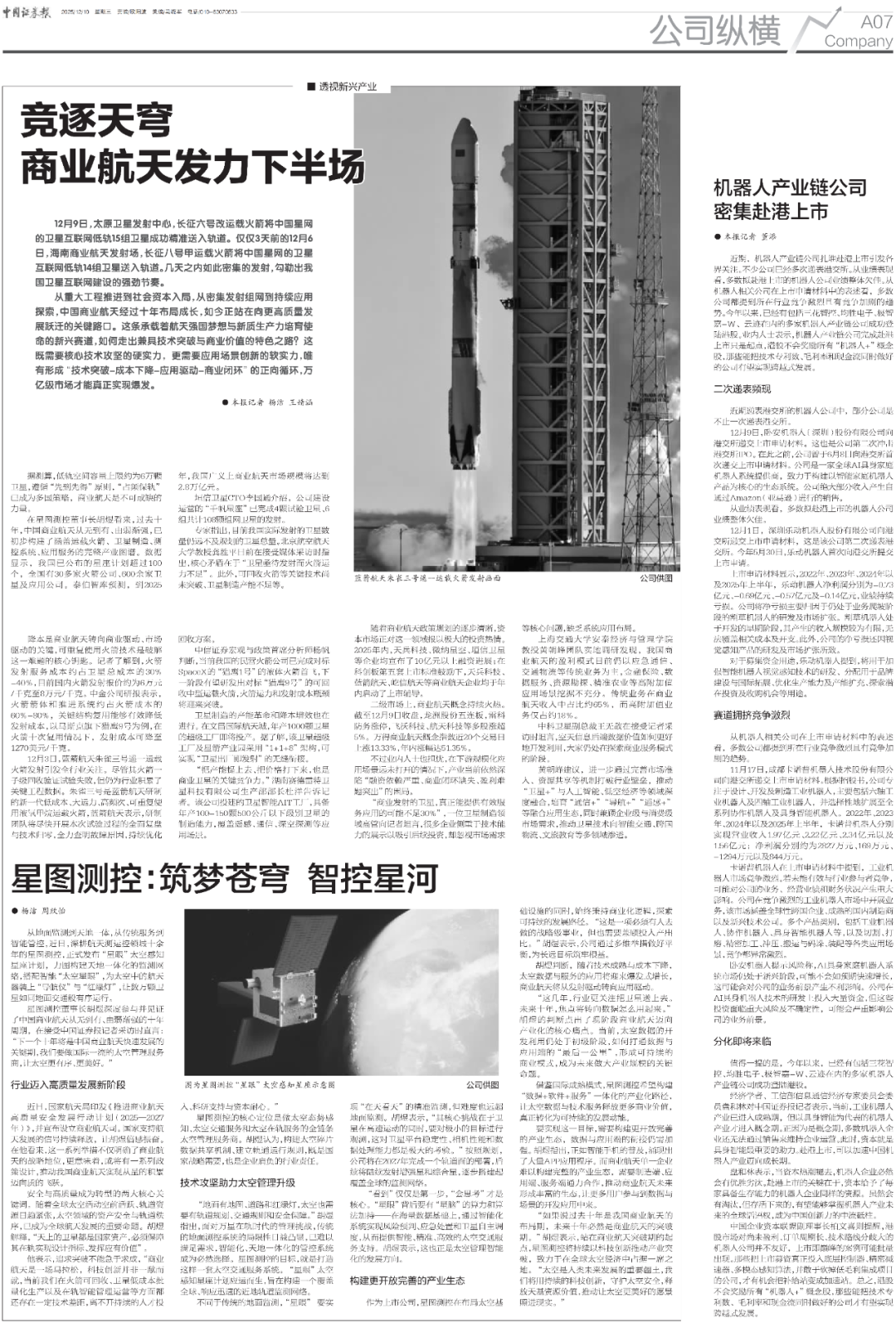 12月10日,《中国证券报》发布了题为“星图测控:筑梦苍穹 智控星河”的新闻报道。该报道以我国商业航天当前快速发展为背景,专访董事长胡煜,重点介绍了星图测控在太空管理服务的实践与愿景。