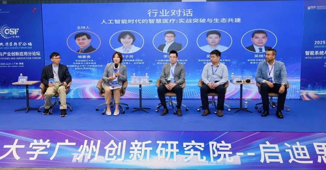 “人工智能时代的智慧医疗:实战突破与生态共建”由新国大广州创新研究院副院长(科研转化)喻豪勇副教授主持,广州医科大学附属第五医院主任医师罗子芮女士、广州赛特智能科技有限公司联合创始人李良源先生、深圳迈瑞生物医疗电子股份有限公司研发总监吴晓华先生、金域医学集团数字化管理中心总经理吴楠先生共同参与。嘉宾围绕智慧医疗的临床转化展开对话,强调医疗AI的发展必须坚持“以临床价值为导向”,当前亟需通过产学研深度协同,攻克数据安全合规、算法可解释性、系统互操作性等关键瓶颈,真正让智能技术服务于诊疗效率提升、康复体验优化与全生命周期健康管理。