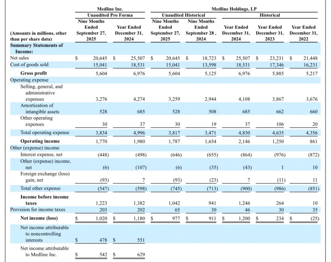 进入2025年,Medline增长势头不减。2025年上半年,公司营收为135.3亿美元,同比增长9.7%;净利润为6.55亿美元,同比增长11.6%。截至2025年9月27日前九个月,公司收入206亿美元,净利润9.77亿美元。