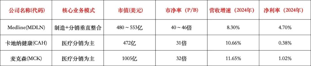Medline此次IPO市值480~553亿美元,对应2024年净利润的市盈率约为40~46倍,显著高于医疗分销行业的平均水平。