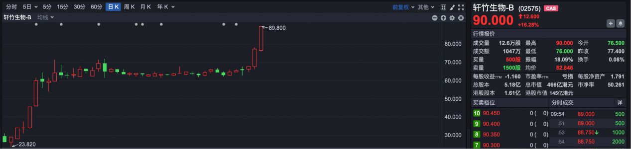 昨日,轩竹生物-B(HK02575)突然发力,大涨14%,今日早盘再度大幅拉升,截至发稿,涨幅超过16%,再创上市以来新高。