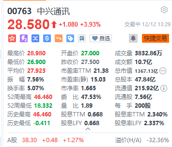 中兴通讯AH股午后双双拉升,H股一度涨逾5%。截至13点29分,中兴通讯A股报38.30元人民币/股,涨幅1.27%;H股报28.58港元/股,涨幅3.93%。