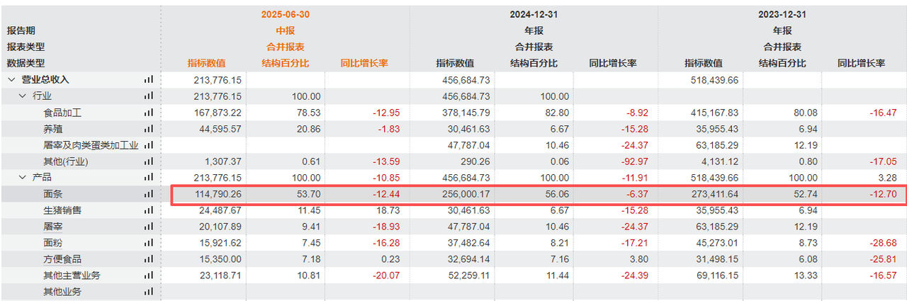 核心业务挂面的销量持续下滑更为明显。数据显示,2023年、2024年以及2025年上半年,克明食品面条业务销量分别同比下滑12.70%、6.37%、12.44%。
