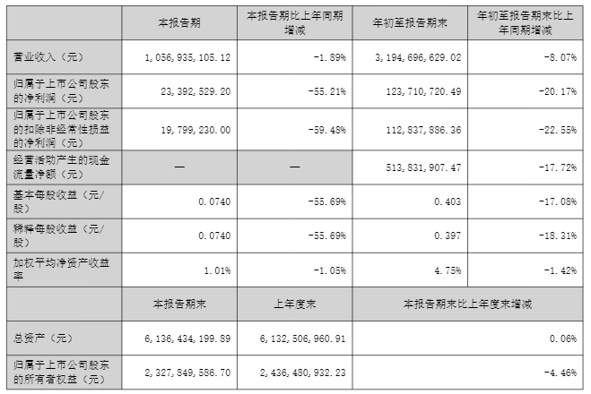 其中,第三季度的营业收入为10.57亿元,同比下降1.89%;归母净利润2339.25万元,同比下降55.21%;扣非净利润1979.92万元,同比下降59.48%。