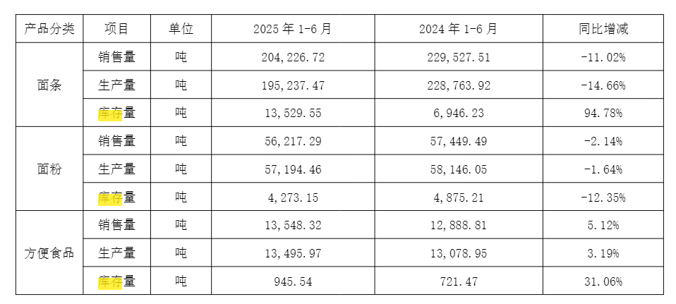 今年上半年,在销售量和生产量双双缩减的情况下,公司面条库存量却高达13529.55吨,同比激增94.78%。产品滞销、库存高企,直观反映了终端需求的疲软。