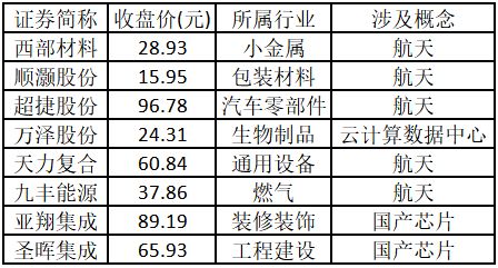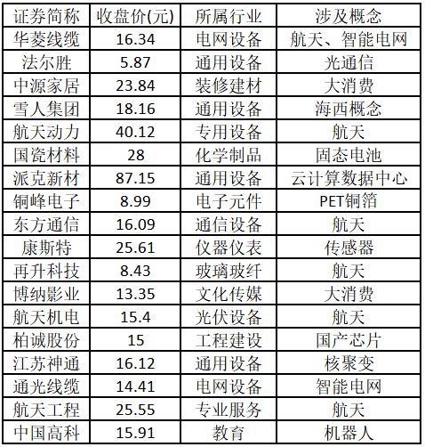 涨停板个股中,股价创出近一年新高的个股有18只(不包括创出历史新高的个股),包括华菱线缆、法尔胜、中源家居、雪人集团、航天动力、国瓷材料、派克新材、铜峰电子、东方通信、康斯特、再升科技、博纳影业、航天机电、柏诚股份、江苏神通、通光线缆、航天工程、中国高科,具体如下表所示。