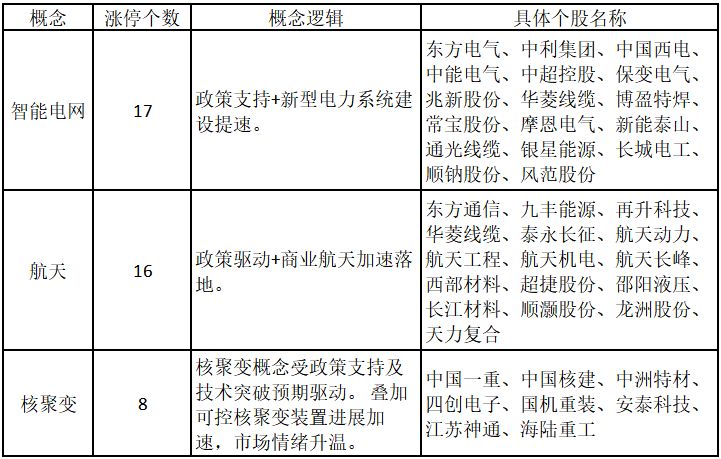 从概念特征来看,今日涨停板个股中,智能电网、航天、核聚变概念的个股最多。