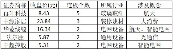 从连板情况来看,今日首板个股有65只;2连板的个股有11只;3连板及以上的个股有2只。今日连板数排名前5的个股包括再升科技、中源家居、华菱线缆、法尔胜、中超控股,具体如下表所示。