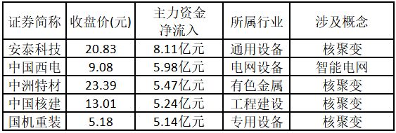 从主力资金来看,今日涨停板个股中,主力资金净流入金额排名前5的个股分别为安泰科技、中国西电、中洲特材、中国核建、国机重装。
