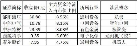 主力资金净流入金额占市值比例排名前5的个股分别为邵阳液压、中能电气、中洲特材、西陇科学、泰尔股份。