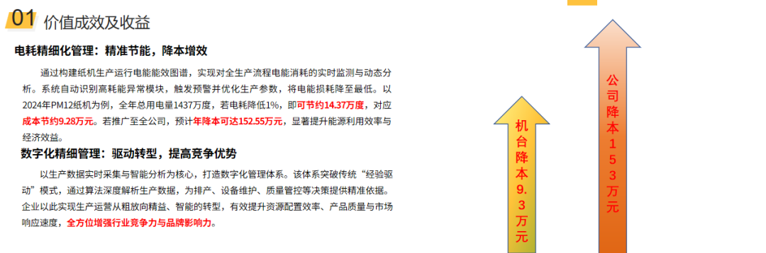 通过构建纸机生产运行电能能效图谱,实现对全生产流程电能消耗的实时监测与动态分析,将电能损耗降至最低,推广至全公司,预计年降本可达152.55万元。