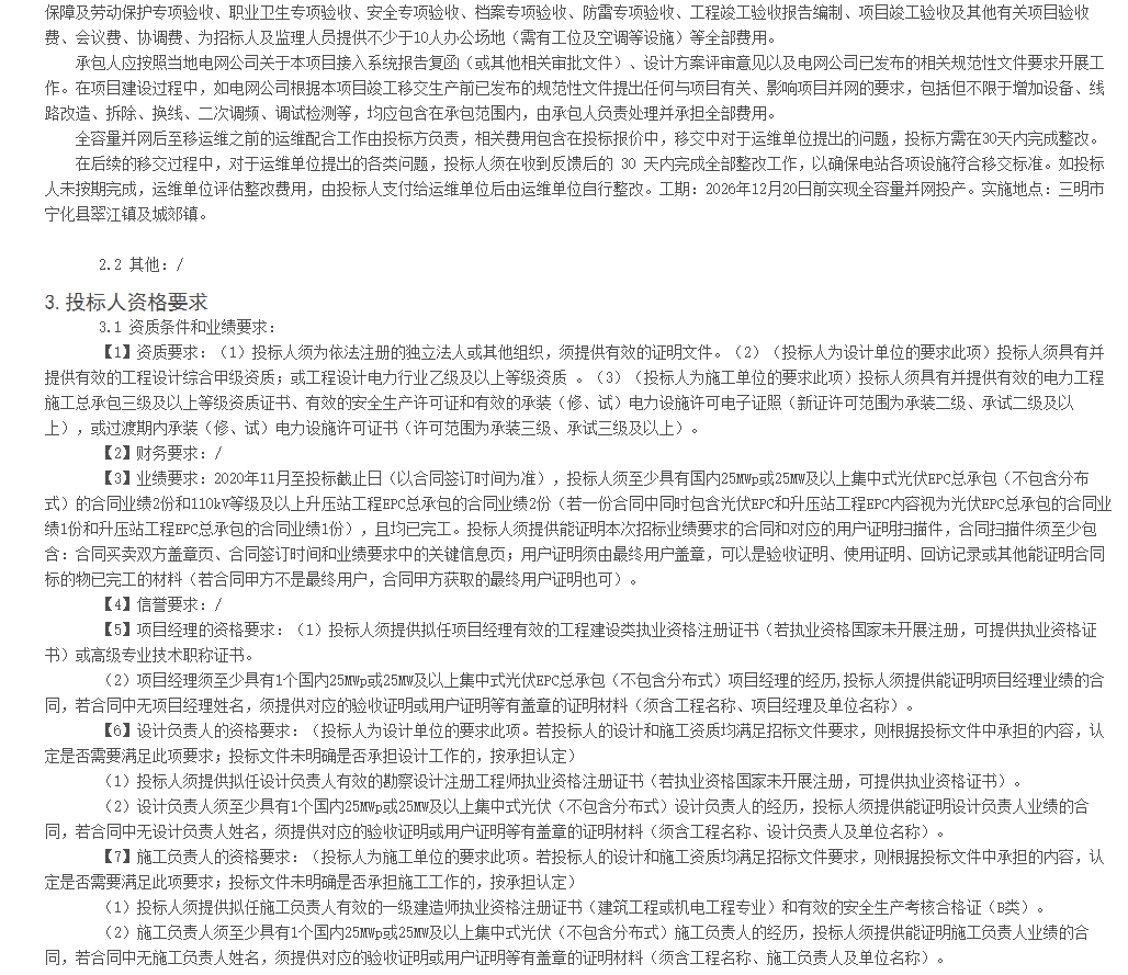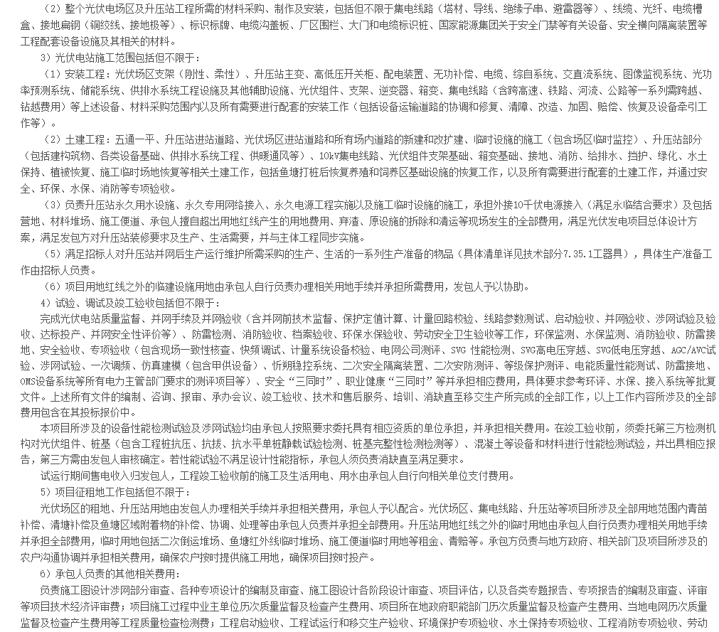 本次招标为项目总承包(EPC),EPC范围为除明确由招标人负责的事项【光伏组件、功率300kW的79台逆变器、北斗时钟同步装置、工程监理、跟踪审计以及已经取得的各项前期报告由招标人负责采购】外的其他所有工作和费用,具体范围见招标公告如下: