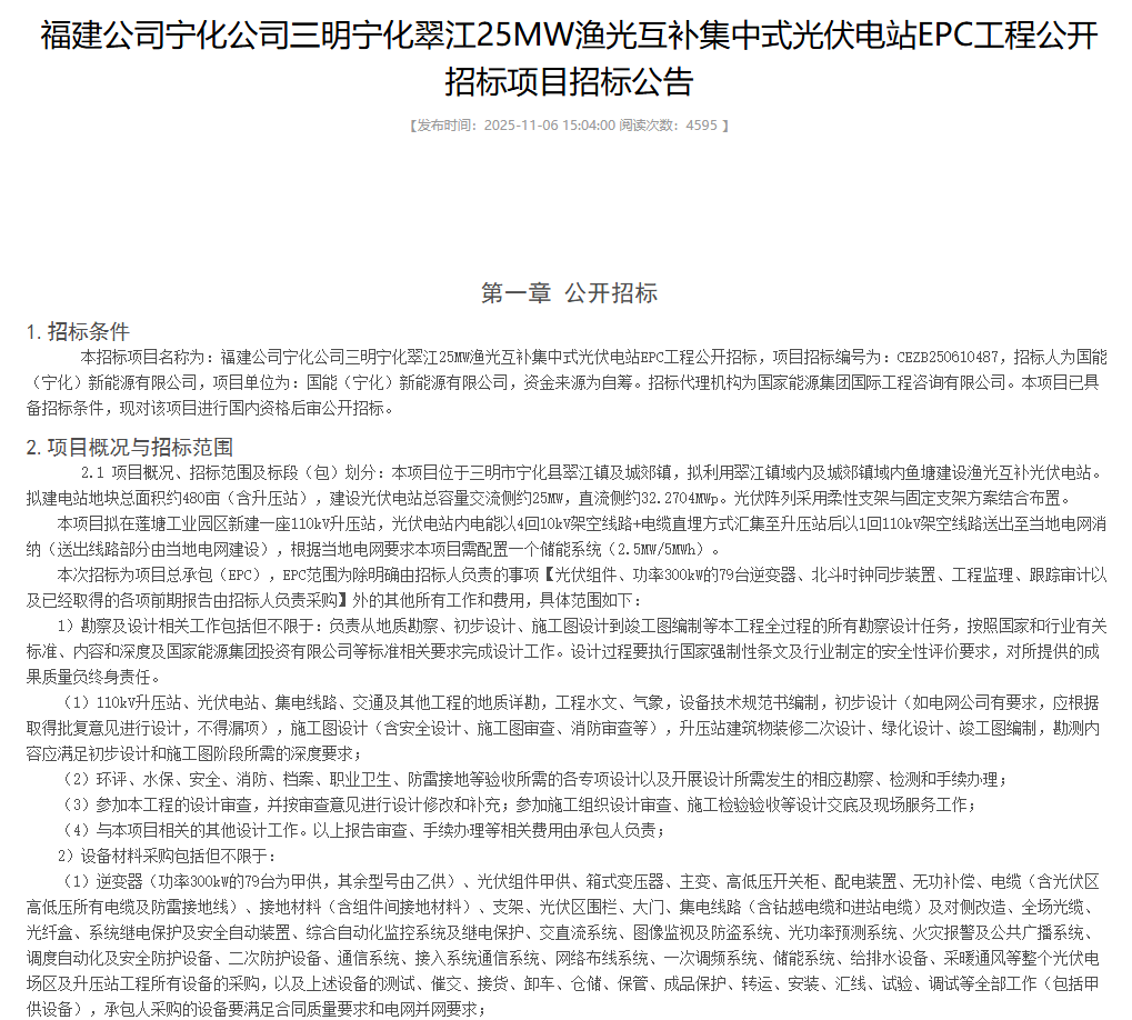 12月10日,【福建公司宁化公司三明宁化翠江25MW渔光互补集中式光伏电站EPC工程公开招标】中标候选人公示: