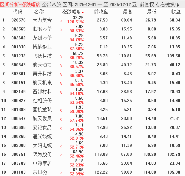 12月以来,A股大盘表现平稳,商业航天概念涨幅居前,如天力复合、顺灏股份、航天动力、航天发展等大涨。