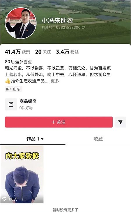 目前,涉事抖音账号已清空视频及商品橱窗,仅保留一条道歉视频。该账号粉丝量约3.4万,累计获赞超过41.4万。