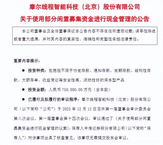 【环球网财经综合报道】被称为“国产GPU第一股”的摩尔线程智能科技(北京)股份有限公司,在科创板上市仅一周后,便因一则拟使用大额募集资金进行现金管理的公告成为市场焦点。12日晚间,公司公告称,计划使用最高不超过75亿元的闲置募集资金进行现金管理,投资于安全性高、流动性好的保本型产品,期限不超过12个月。
