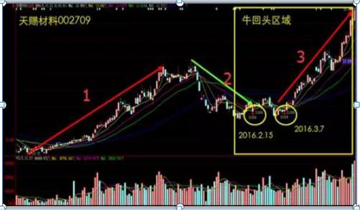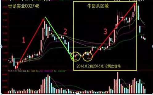 抓不到第一波没关系,这种牛股,大多数人都抓不到第一波,但是我们可以比较容易的抓到第二波或者第三波。图中2的位置,就是这个股票大幅上涨之后的一个深度调整,经过几个月的时间后,这个股票又来了第二波上涨行情,而且这第二波不必第一波小。那么在2和3之间就出现了一个牛回头的机会。就是图中,两个黄色圆圈发出信号的地方,这就是牛回头。
